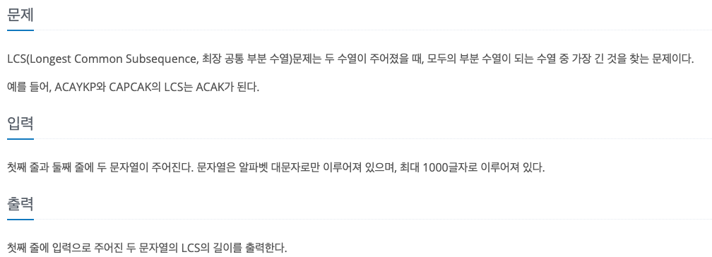 * LCS = 두 수열에서 가장 긴 공통부분 수열. 즉, 연속적일 필요는 없으나 순서가 일치하는 부분 수열이어야 한다.