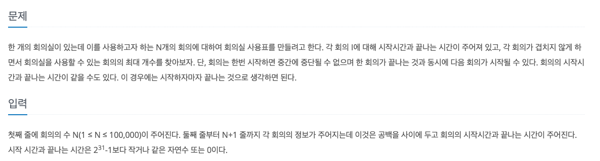 이 문제를 처음 봤을 때는, 당연히 시작하는 시간을 기준으로만 생각했다. 시작 시간이 작은 순서대로 배열하고 시작 시간이 같다면 끝 시간이 작은 순서대로 배열하여 비교해가며 정렬하면 최대 횟수가 나올 것이라고 생각했다.